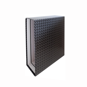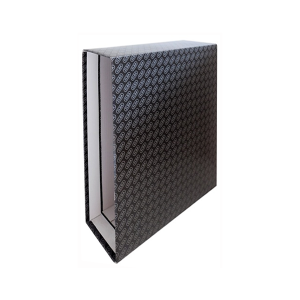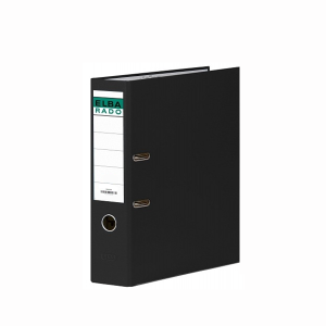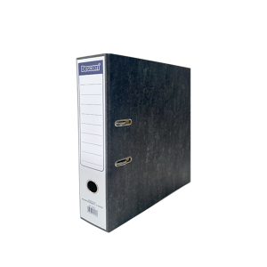 Archivador de palanca de cartón lomo de 75 mm tamaño folio con rado. Forrado exterior cartón negro jaspeado, con cantoneras metálicas en la base para una mejor extracción y anillas con compresor. Etiqueta frontal y ollado metálico en el lomo.